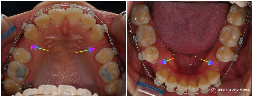 이 공간을 이용해 앞니를 후방으로 당기면 자연스럽게 정상적인 교합을 만들 수 있습니다.