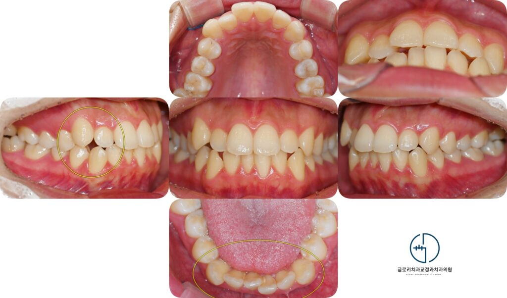 상봉동 교정치과 에서 준비한 구강사진을 보면 현재 앞니가 서로 겹쳐 배열되어있으며 치열이 전반적으로 고르지