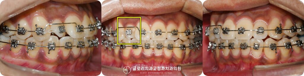 고무줄과 브라켓의 협측힘을 동시에 활용해 치아 양쪽에서 회전력을 가하는 방식으로 접근하게 됩니다.