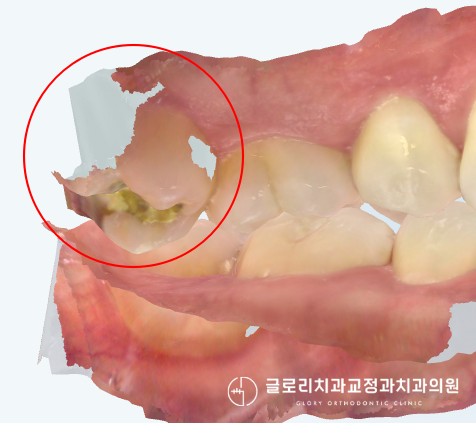 스캔 데이터로 확인하면 밖으로 뻐드러진 어금니가 교합 기능 수행을 하지 못하고 있다는 것을 명확하게 파악할 수 있습니다.