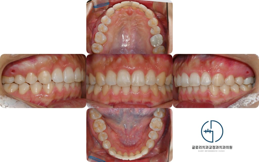 현재 위아래 치열이 가지런히 정돈된 모습으로 과도하게 덮여있던 앞니가