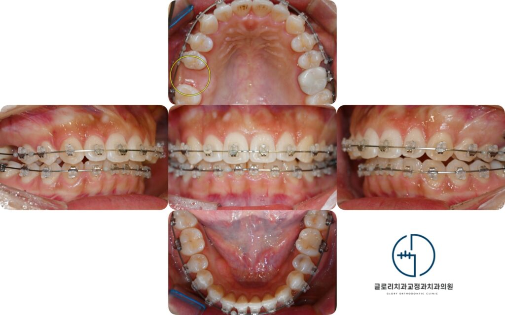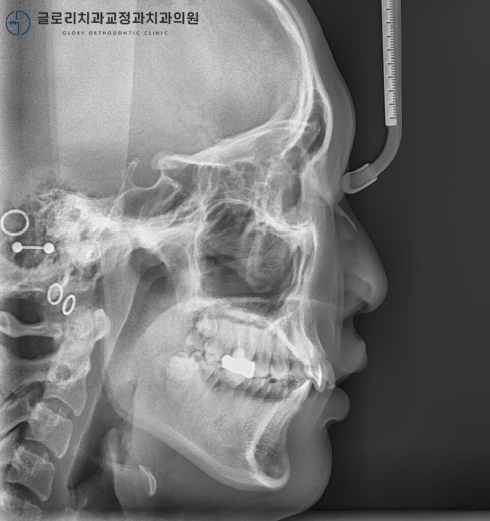 부정교합에 해당하는 소견으로 얼굴의 수직적 길이는 정상이나 전후 관계에서 불균형이 존재했다 판단됩니다.