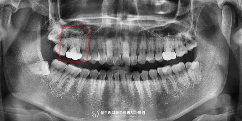 특히나 한 치아가 앞으로 돌출되어 솟아 있는 모습이 확인됩니다.