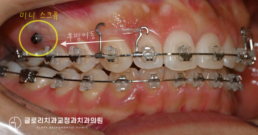 이때 앞서 언급했듯이 위턱을 뒤쪽으로 움직이게 하기 위해서는 미니스크류를 보조 고정원으로