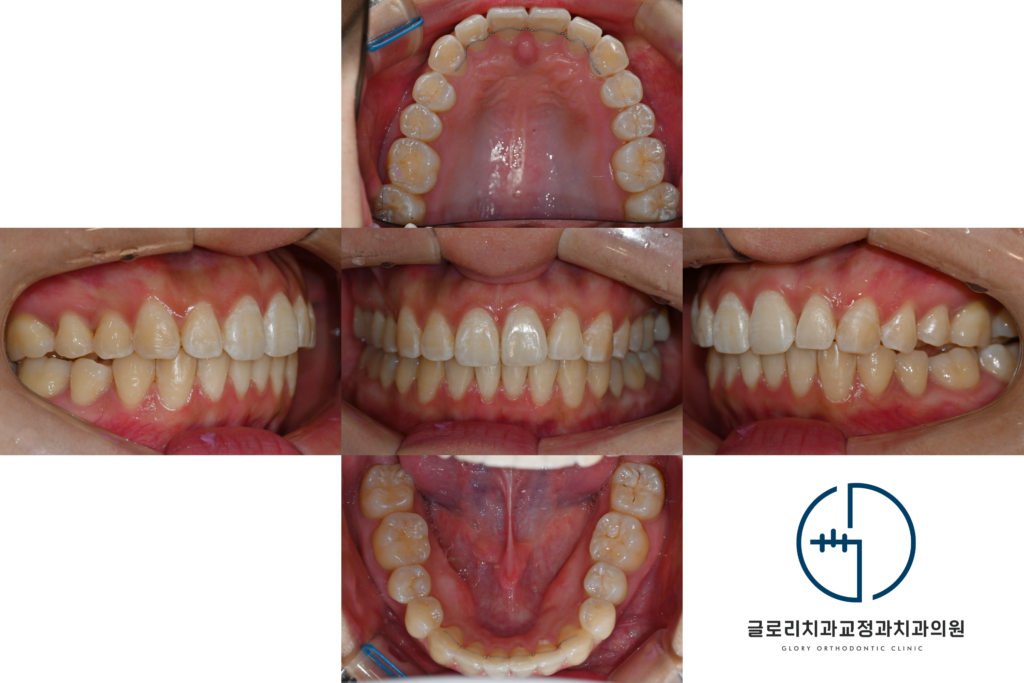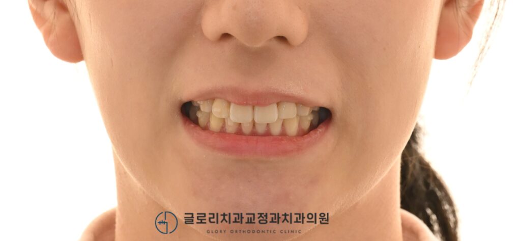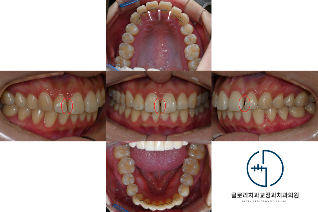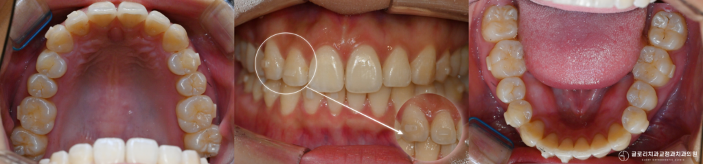 재교정 후에는 벌어졌던 앞니 사이 공간이 닫히며 다시 가지런해진 치열을 확인할 수 있습니다.