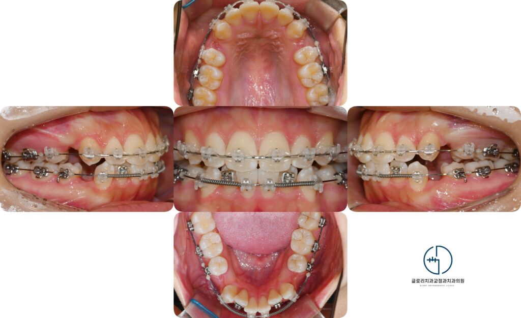 이번 케이스에서는 공간 확보를 위해 위아래 4개 소구치가 제거되었는데 이를 통해 돌출된 앞니를 후방으로