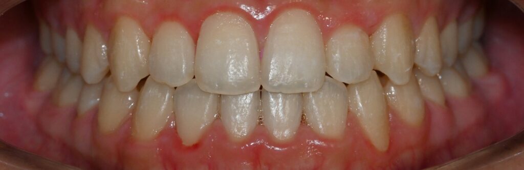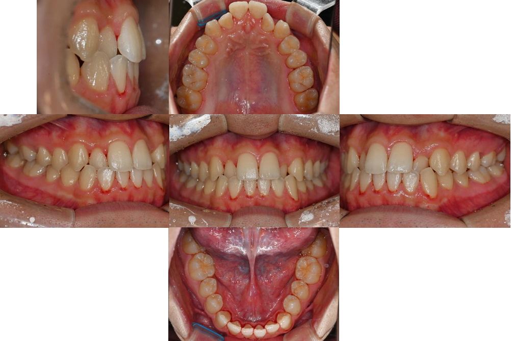 가장 눈에 띄는 문제는 위 앞니가 삐뚤빼뚤하며 위아래 측절치가 거꾸로 교합되는 앞니 반대교합이었습니다.
