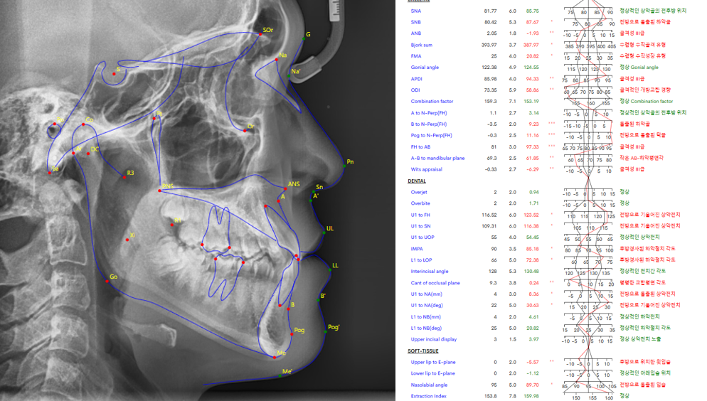 얼굴 분석 결과, 코끝과 턱끝을 이은 선을 기준으로 하여 입술이 후퇴되어 있었고, 얼굴의 길이가 수직적으로 짧은 편이었습니다. 또한 연조직 관련 계측치에서도 후퇴된 입술 경향을 보입니다.