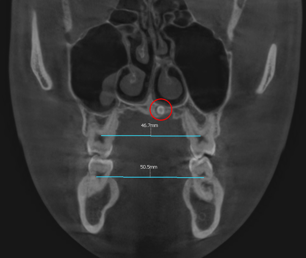 정상적으로는 상악이 0-1mm 정도 더 큰 값을 보여야 하는데, 이 비율이 맞지 않아 전체적인 교합의 안정성에 영향을 미치고 있었습니다. → 상악 중절치 사이에 과잉치가 관찰되어 상악골 확장은 하지 않는 방향으로 결정했습니다. 과잉치의 존재는 치료 계획에 중요한 변수가 되며, 이를 고려하지 않은 확장 치료는 오히려 치료 결과에 부정적 영향을 미칠 수 있기 때문입니다.