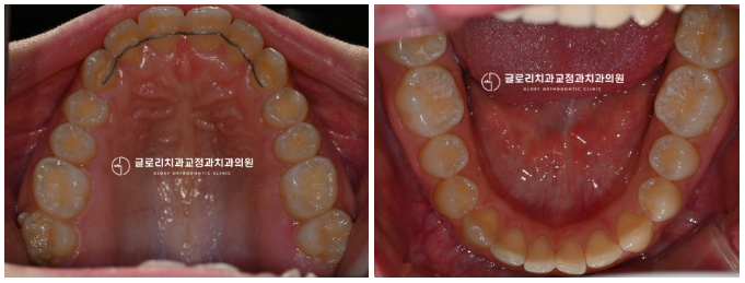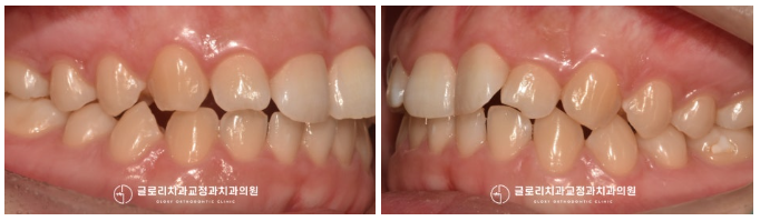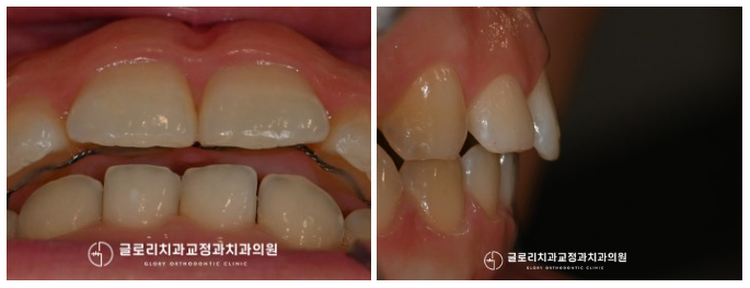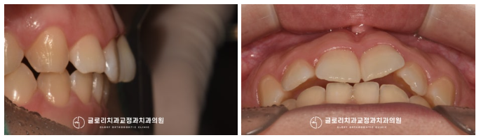 틀어져 있는 전치부 치아를 볼 수 있는데요.